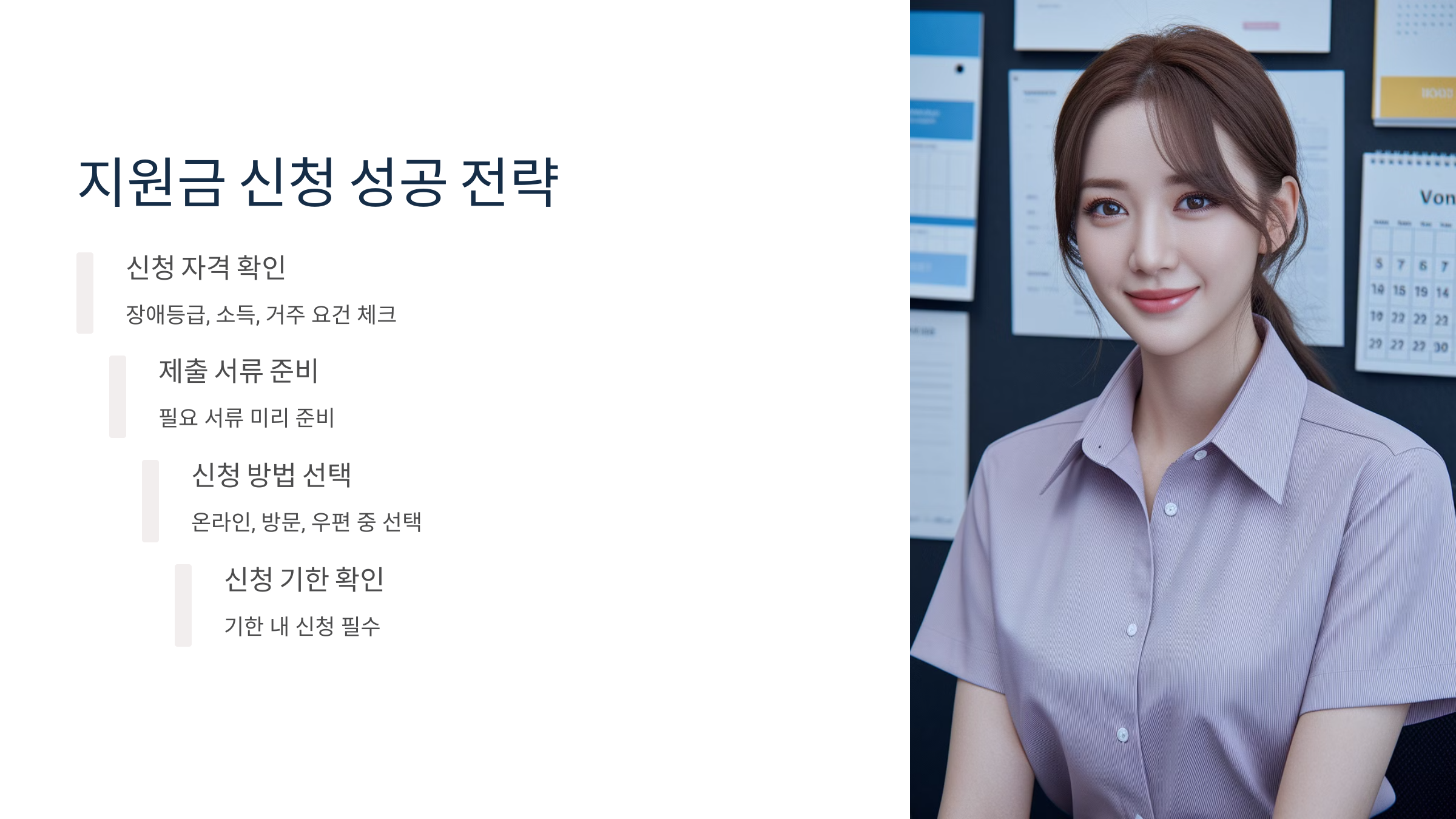 온라인 신청 시에는 본인 인증 절차를 거쳐야 하며, 필요한 서류를 스캔하거나 사진 파일로 준비해야 합니다. 오프라인 신청 시에는 신분증, 장애인 등록증, 통장 사본 등 필요한 서류를 지참하고 방문해야 합니다.