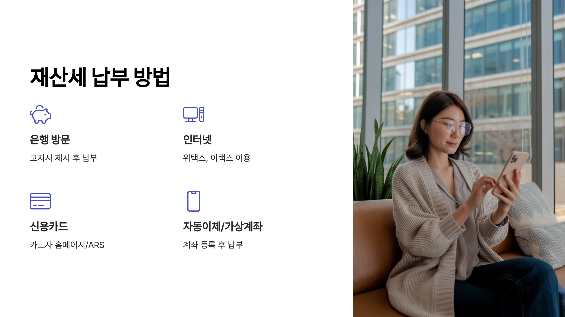 | 납부 방법 | 은행, 인터넷(위택스, 이택스), 신용카드, 자동이체, 가상계좌 |