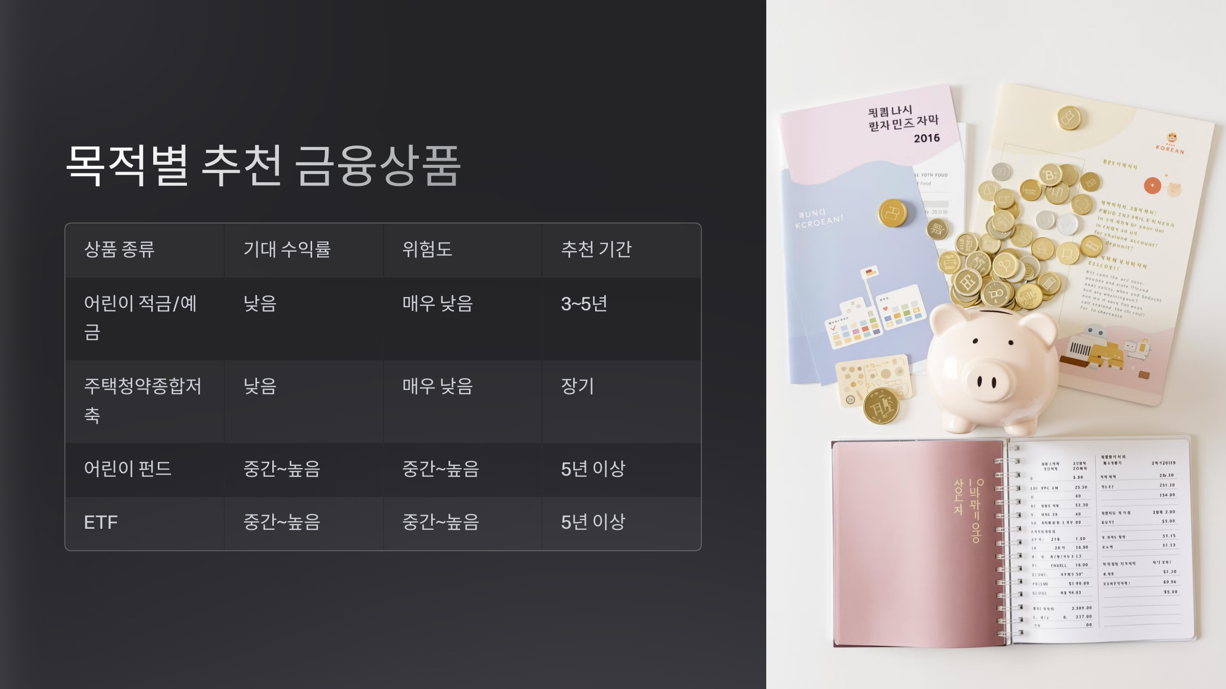 | 상품 종류 | 주요 특징 | 기대 수익률 | 위험도 | 추천 목표/기간 | 핵심 활용 팁 (지원금 연계) |
