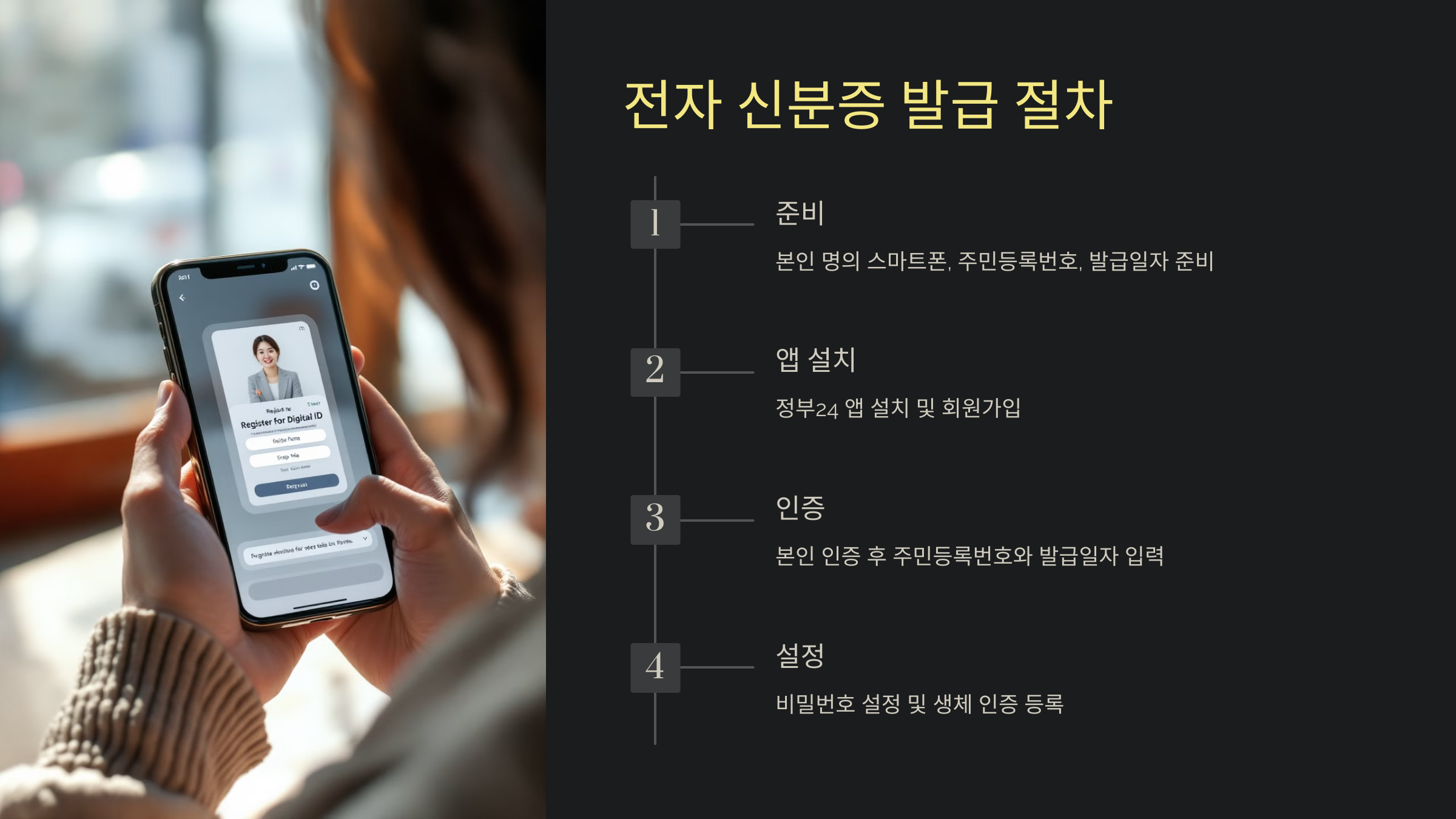정부24 전자 신분증 발급 절차는 다음 단계를 따라 진행됩니다: