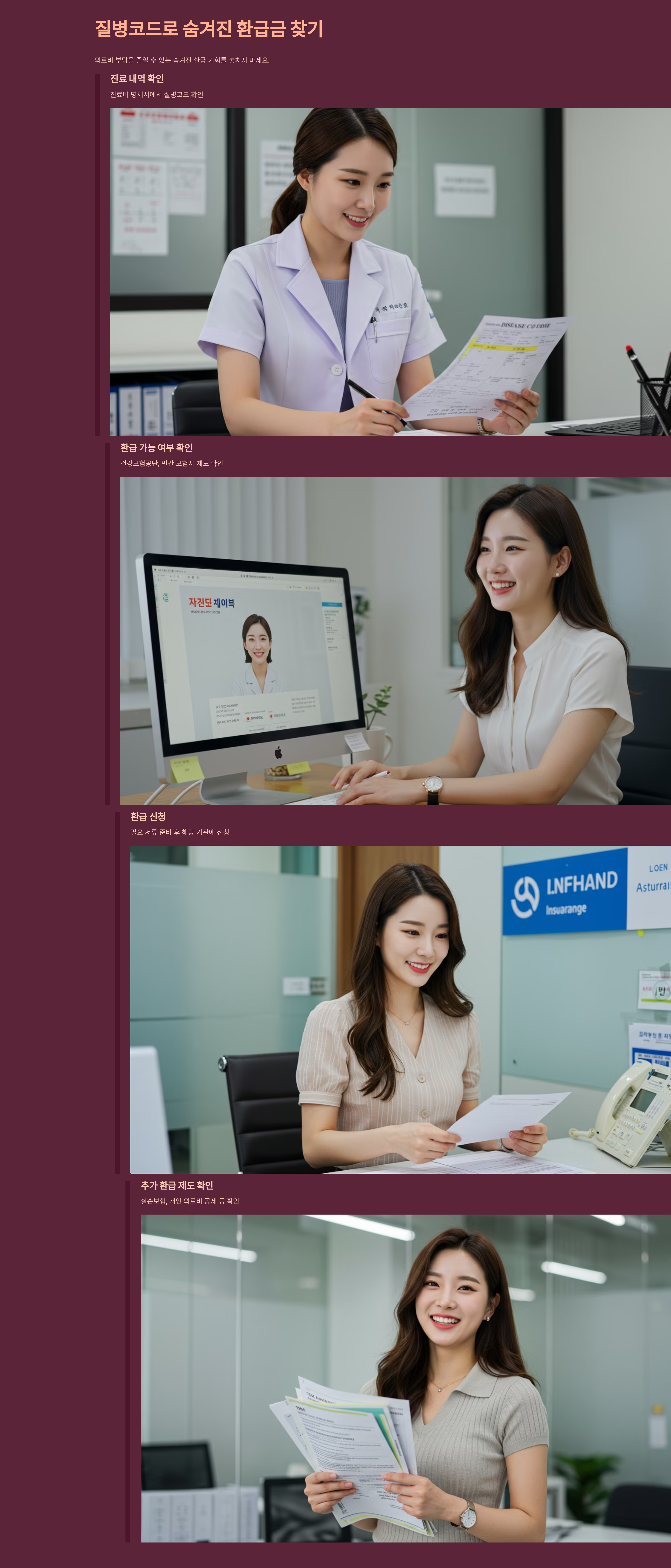 - 환급 가능 여부 확인: 확인된 질병코드를 바탕으로 건강보험공단, 민간 보험사 등에서 제공하는 환급 제도 대상에 해당하는지 확인합니다.