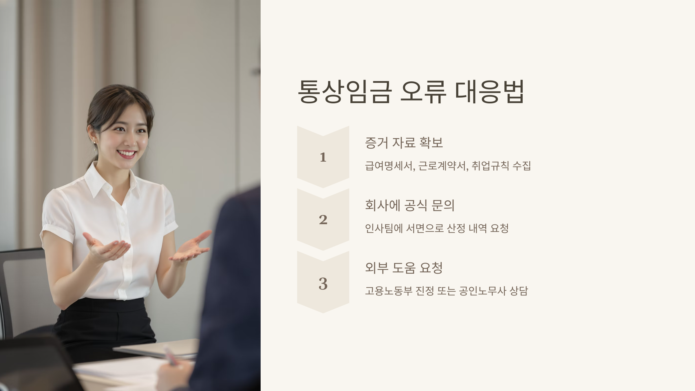 - 회사와 재협의: 오류가 명확하다고 판단될 경우, 구체적인 근거를 들어 회사에 정정 및 차액(예상 출산휴가 급여 차액 포함) 지급 요구.