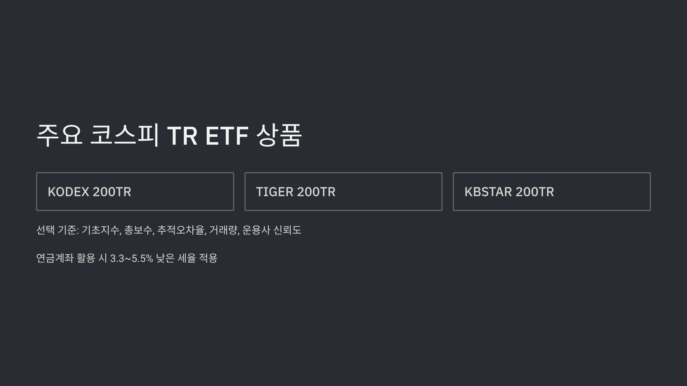 | TIGER 200TR | 미래에셋자산운용 | 0.09% | 약 2,600억 원 | TIGER 브랜드의 TR 상품으로, 장기 투자자에게 유리. |