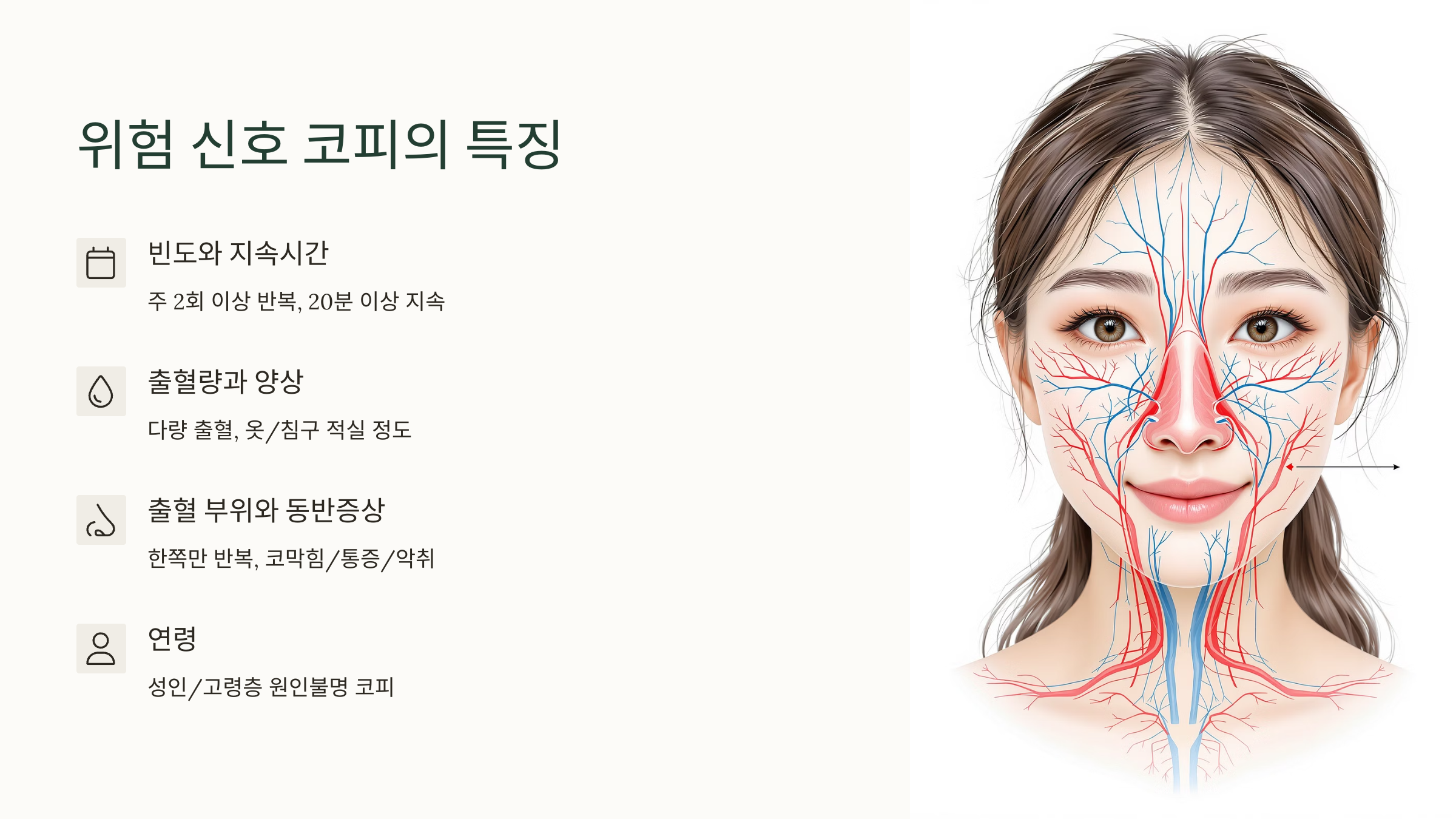 | 코피 빈도/지속 시간 | 주 2회 이상 반복 / 20분 이상 지혈 안 됨 | 혈액응고장애, 고혈압, 후방출혈 등 | 이비인후과 또는 응급실 방문 |