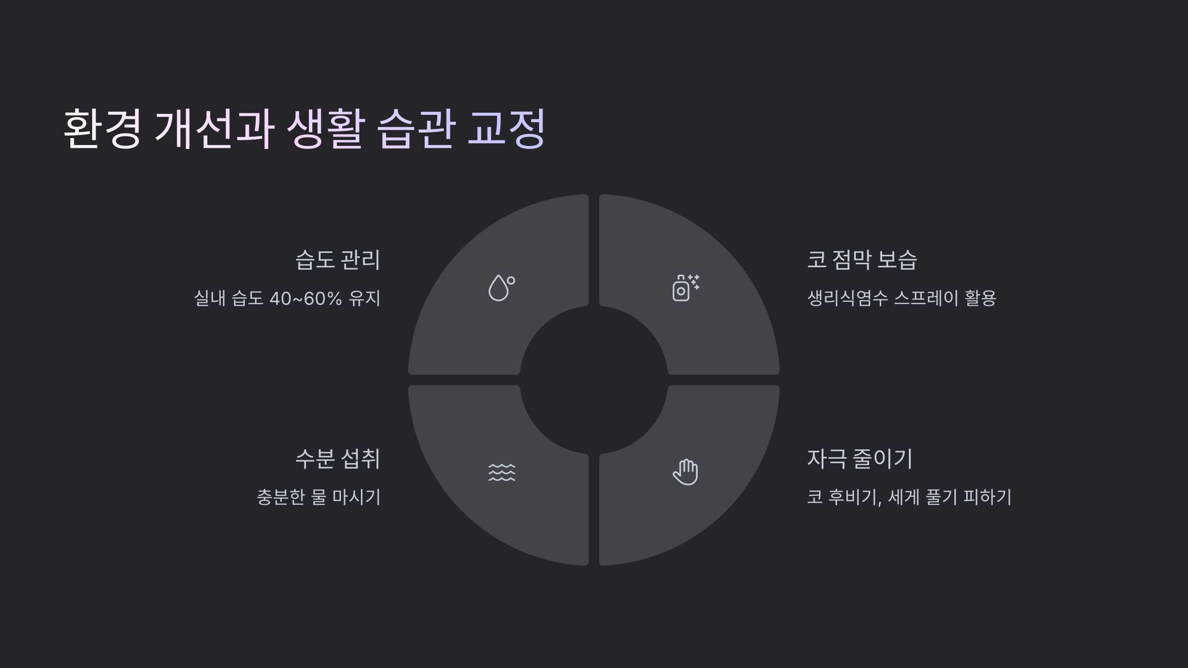| 코 점막 보습 | 의사의 처방에 따라 생리식염수 코 세척 또는 스프레이 사용, 잠자기 전 코 입구에 바셀린이나 보습 연고 소량 바르기 | 중간 | 코가 자주 건조하거나 딱지가 생길 때 도움 |