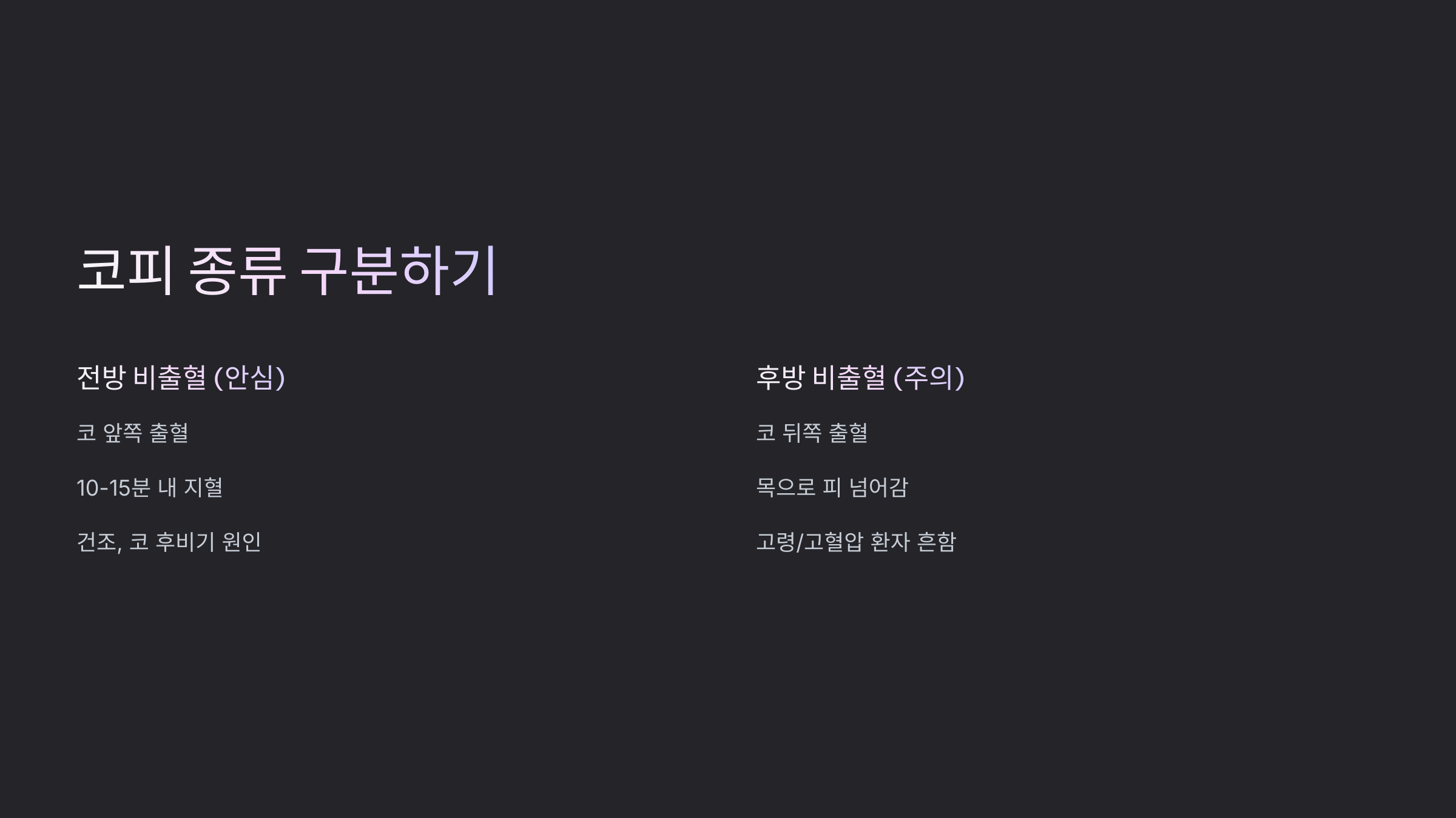 - 전방 비출혈 특징: 코 앞쪽 출혈, 비교적 적은 출혈량, 압박 지혈로 잘 멈춤, 흔한 원인(건조, 코 후비기 등), 대부분 심각하지 않음.
