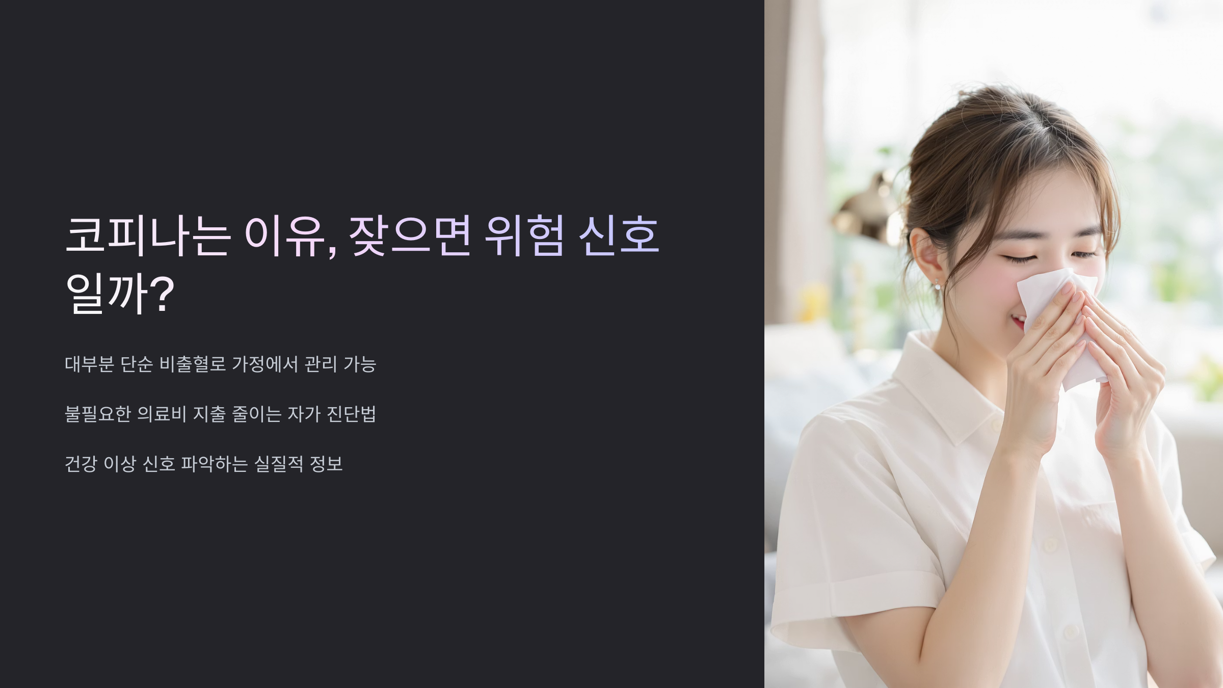 코피나는 이유: 병원 방문 결정 전 확인! 불필요한 지출 막는 자가 진단법은 갑작스러운 코피에 당황하지 않고 현명하게 대처하여 불필요한 병원 방문과 의료비 지출을 줄이는 데 도움을 드리고자 합니다. 이 글에서는 코피의 심각성을 스스로 판단할 수 있는 구체적인 기준과 자가 관리 방법을 제시하여, 언제 전문가의 도움이 필요한지 명확히 알려드립니다.