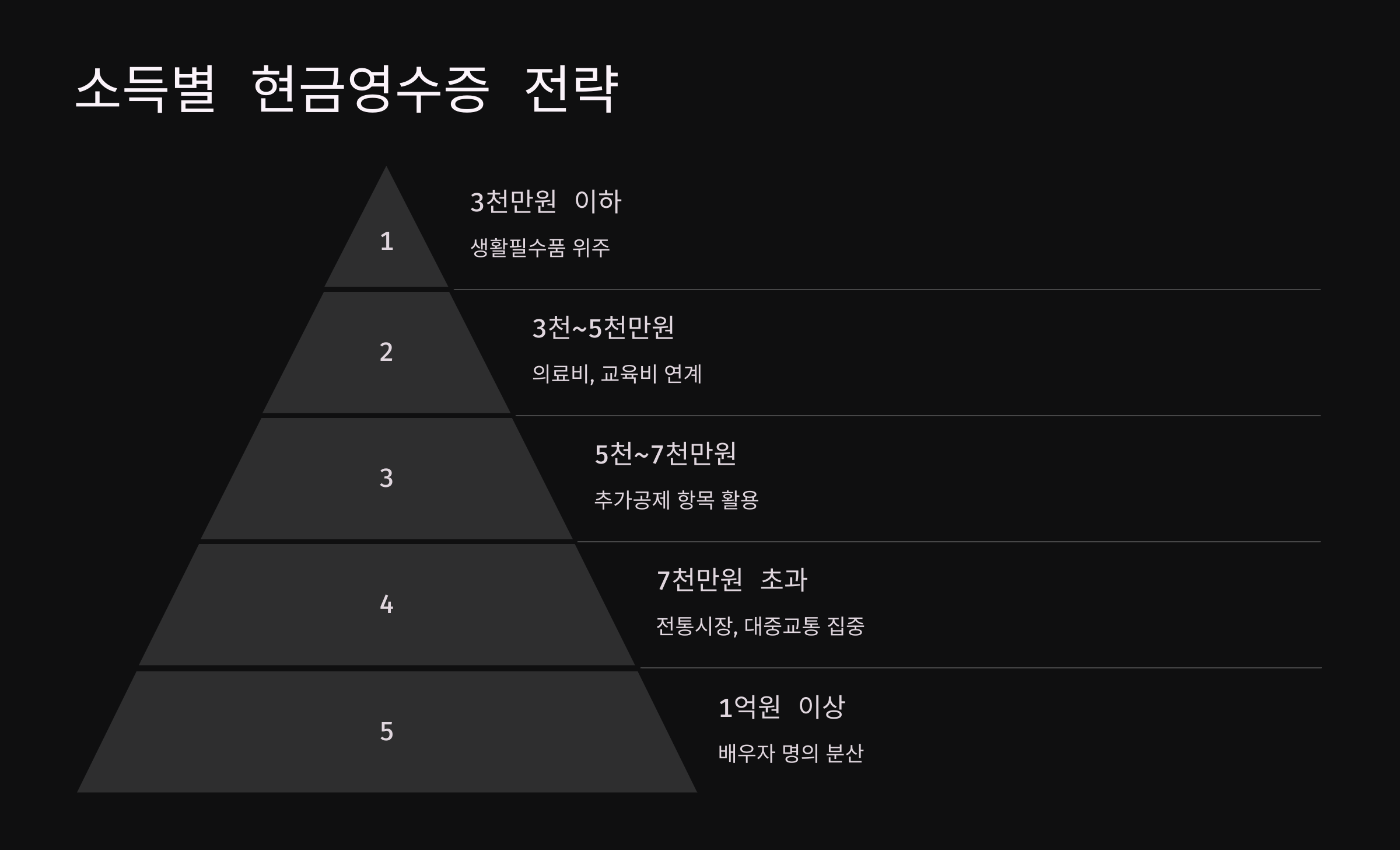 소득 구간별로 효과적인 현금영수증 활용 방법이 다릅니다. 다음은 소득 구간별 추천 전략입니다: