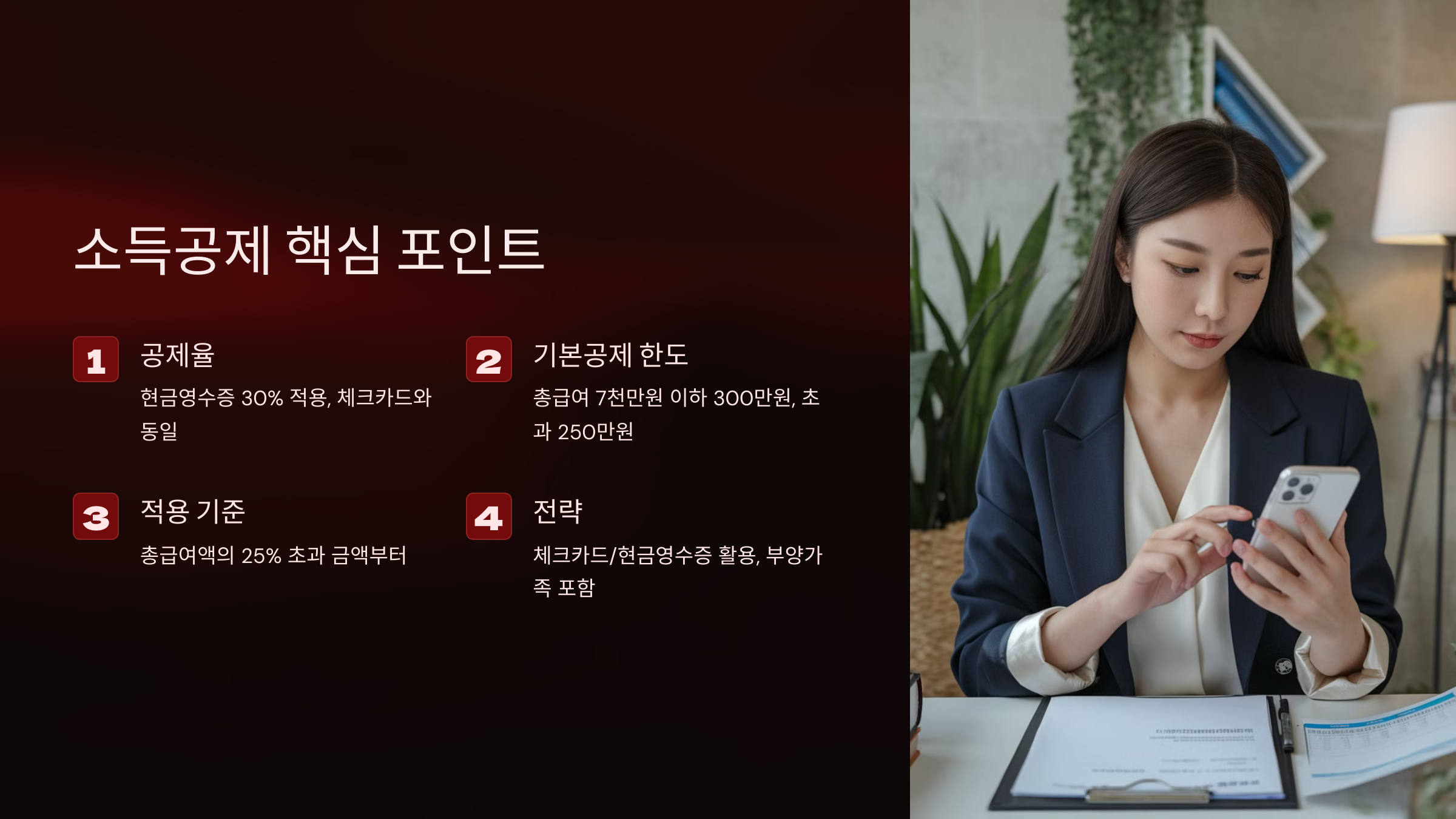 현금영수증 소득공제는 사용금액의 30%가 적용되며, 이는 체크카드와 동일한 공제율입니다. 총급여 7천만원 이하인 근로자의 경우 기본공제 한도가 300만원이며, 7천만원을 초과하는 경우에는 250만원이 적용됩니다.