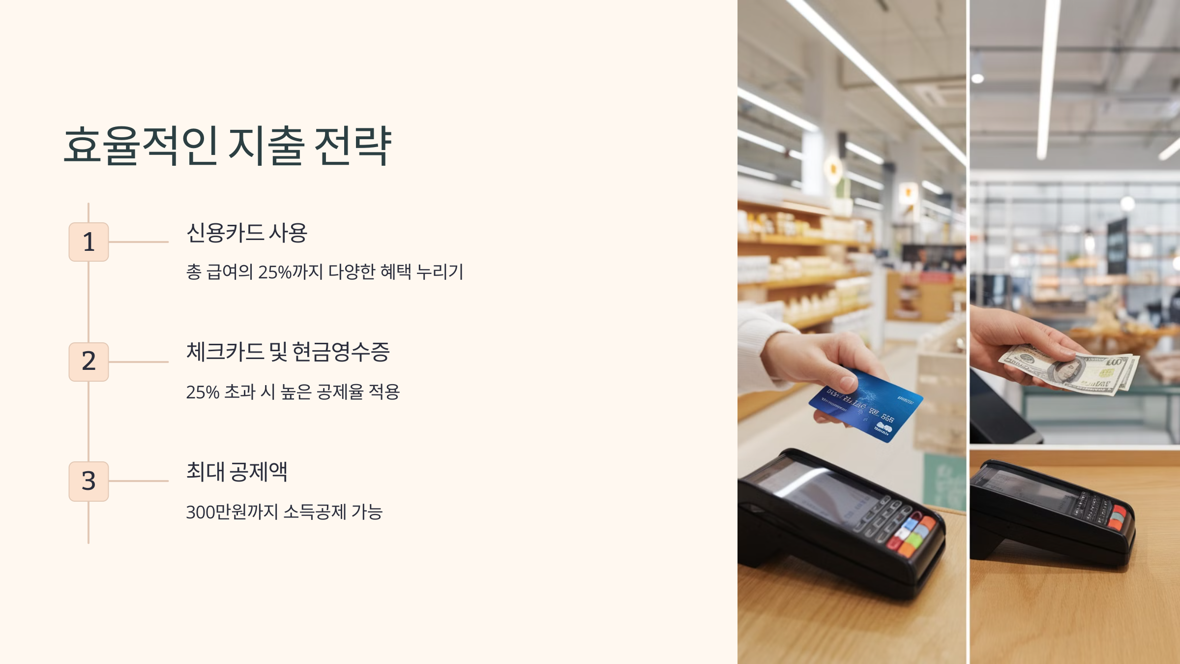 효율적인 지출 전략은 연말정산 시 최대의 환급 효과를 가져옵니다. 총 급여의 25%까지는 신용카드 사용을 통해 다양한 혜택을 누리되, 그 이후로는 체크카드 및 현금영수증을 활용하여 높은 공제율을 적용받을 수 있도록 계획하는 것이 바람직합니다. 이를 통해 최대 300만원까지 소득공제를 받을 수 있습니다.