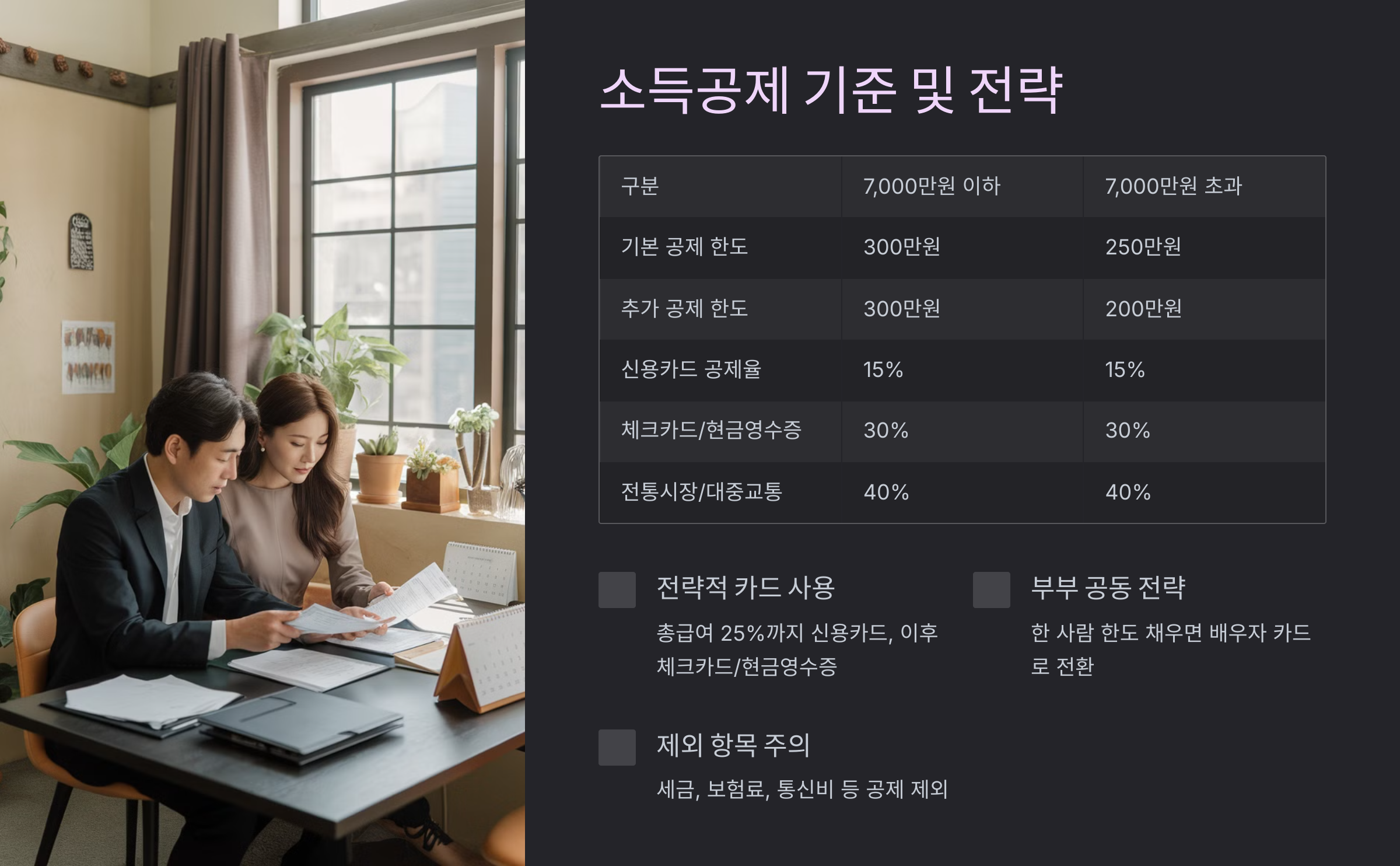 - 부부 간 카드 사용액을 적절히 조정하여 공제 가능 금액을 극대화합니다.