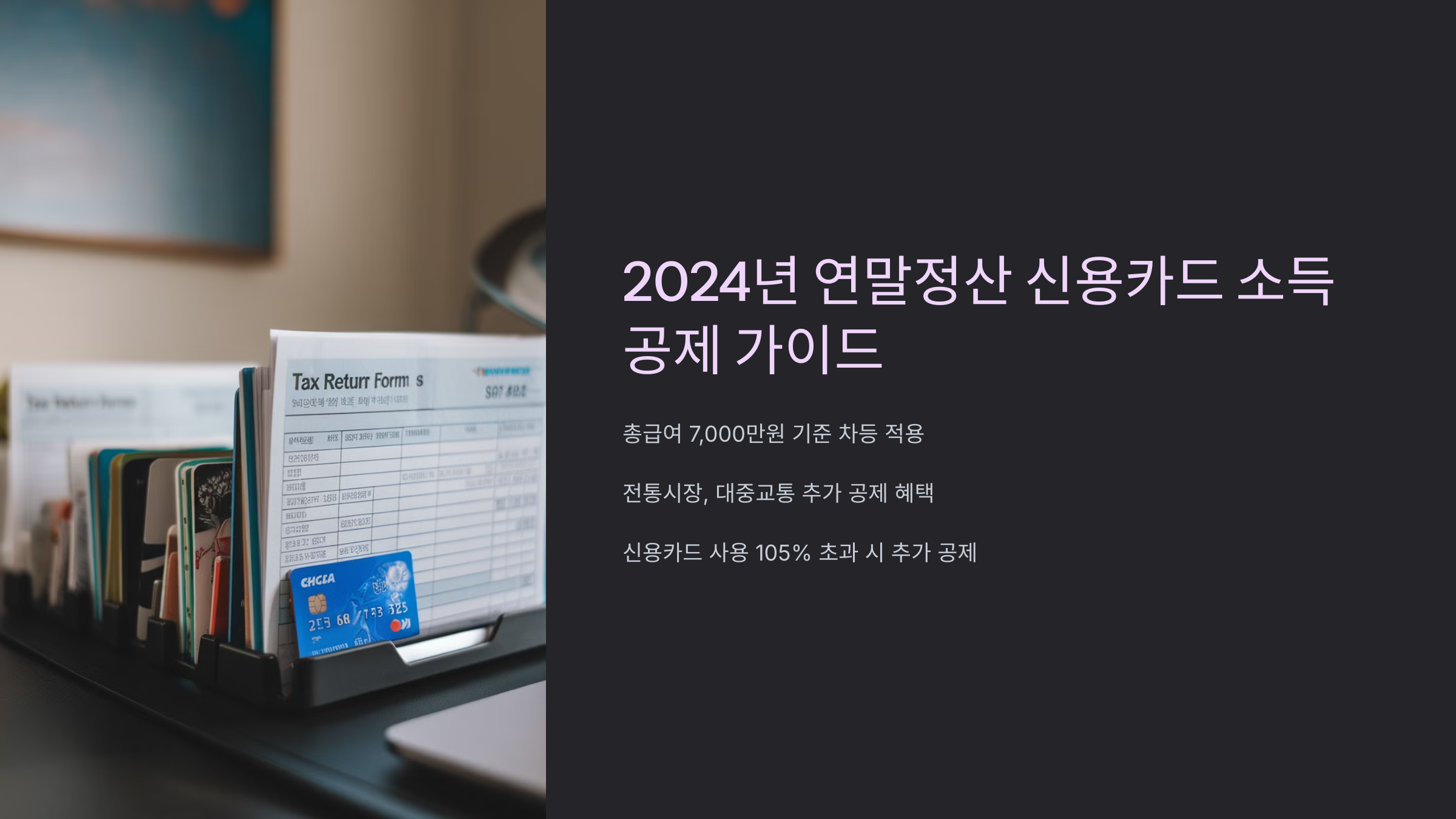 연말정산 시즌을 맞이하여 현금영수증과 신용카드 소득공제에 대한 상세한 정보를 정리했습니다. 2024년에는 총급여 7,000만원을 기준으로 소득공제 한도가 차등 적용되며, 전통시장과 대중교통 이용 시 추가 공제 혜택이 있습니다. 특히 올해부터는 신용카드 사용금액이 전년 대비 105% 이상 증가한 경우 추가 공제 혜택을 받을 수 있어 더욱 세심한 카드 사용 계획이 필요합니다.