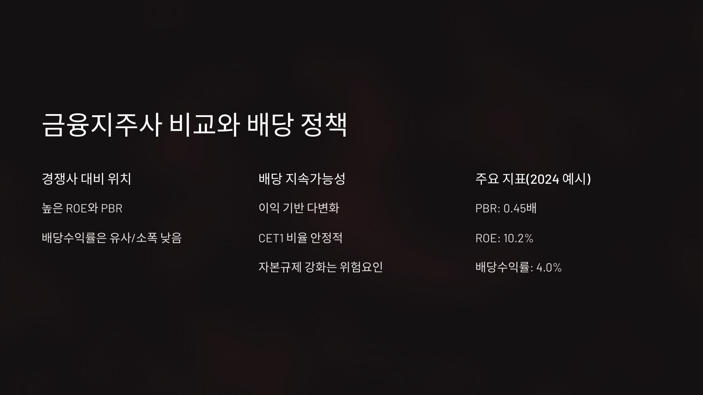 - ROE 개선 지속 가능성: 수익성 개선 추세가 유지될 수 있는지 여부 (NIM 관리, 비이자이익 확대 등).