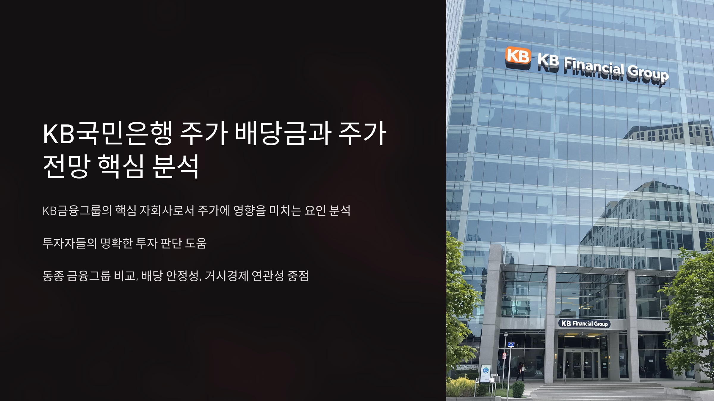 kb국민은행 주가 배당금과 주가 전망 핵심 분석: 본 글에서는 KB금융그룹의 핵심 자회사로서 kb국민은행 주가에 영향을 미치는 배당금 정책의 지속 가능성과 향후 주가 전망에 영향을 줄 수 있는 심층적인 요인들을 전문가적 시각에서 분석하여, 투자자들이 보다 명확한 투자 판단을 내리는 데 실질적인 도움을 드리고자 합니다. 특히 동종 금융그룹과의 비교 분석, 배당 재원의 안정성, 거시경제 변수와의 연관성 등을 중점적으로 다룹니다.