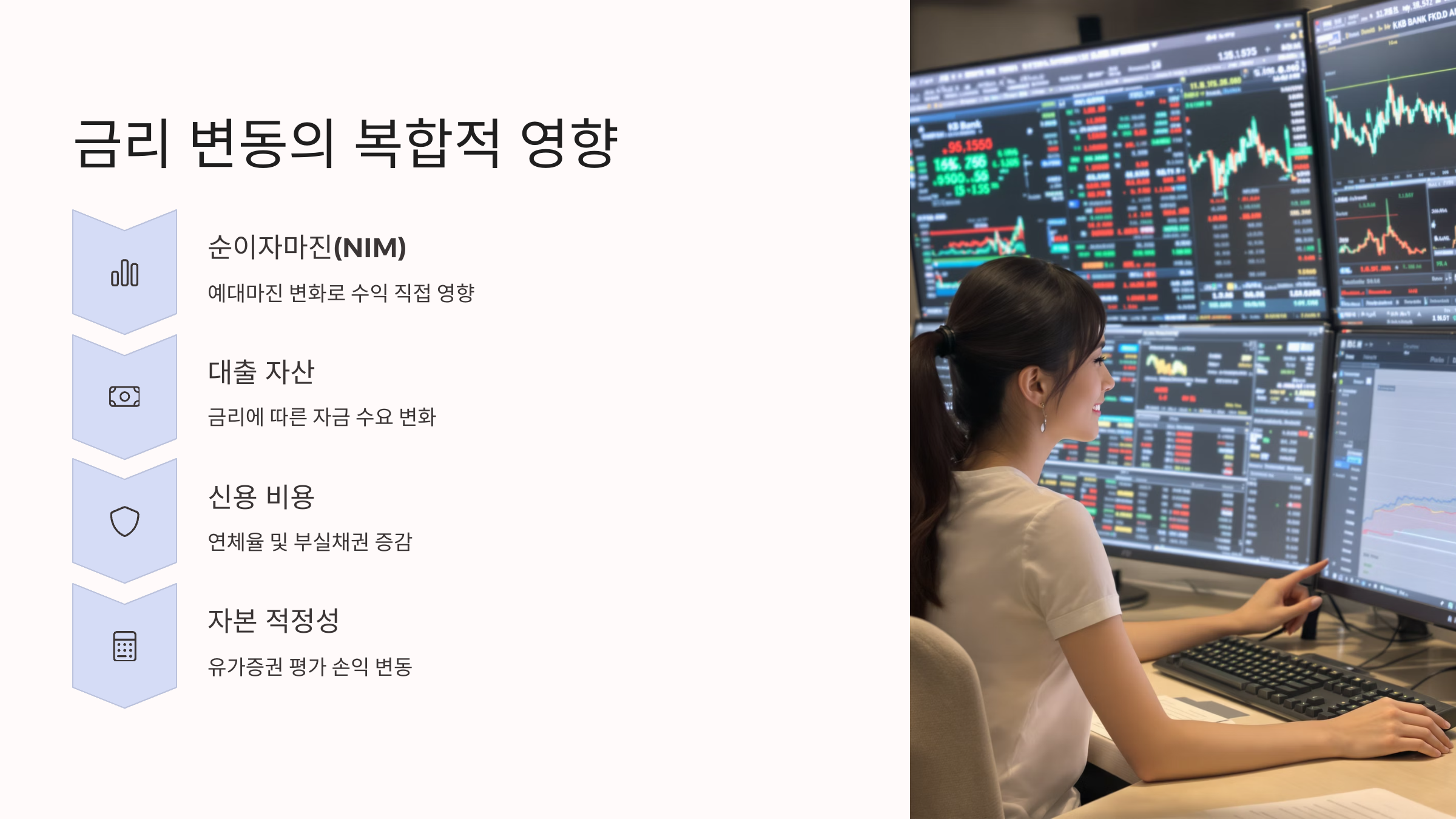 - 기준금리 변화: 순이자마진(NIM) 변동, 대출 수요 및 연체율 변화에 직접적 영향.