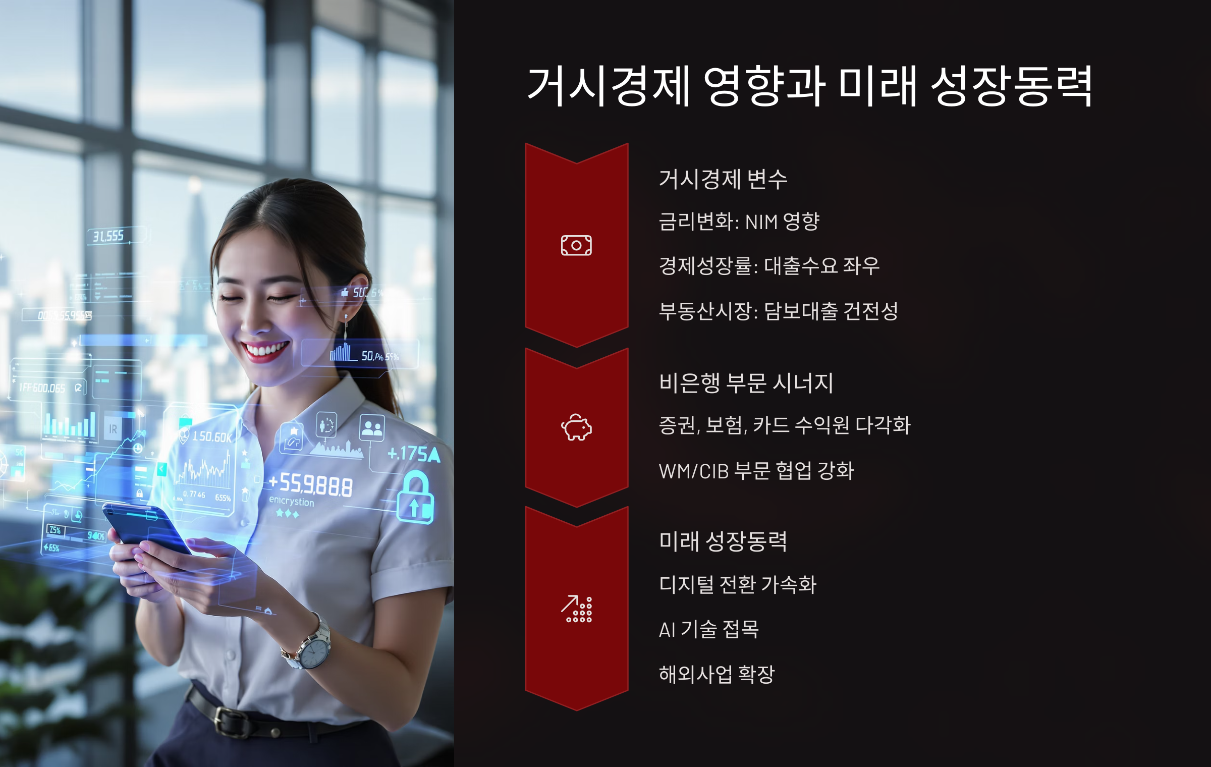 - WM/CIB 협업: 은행-증권 연계 복합점포 운영, 기업 고객 대상 종합 금융 솔루션 제공.