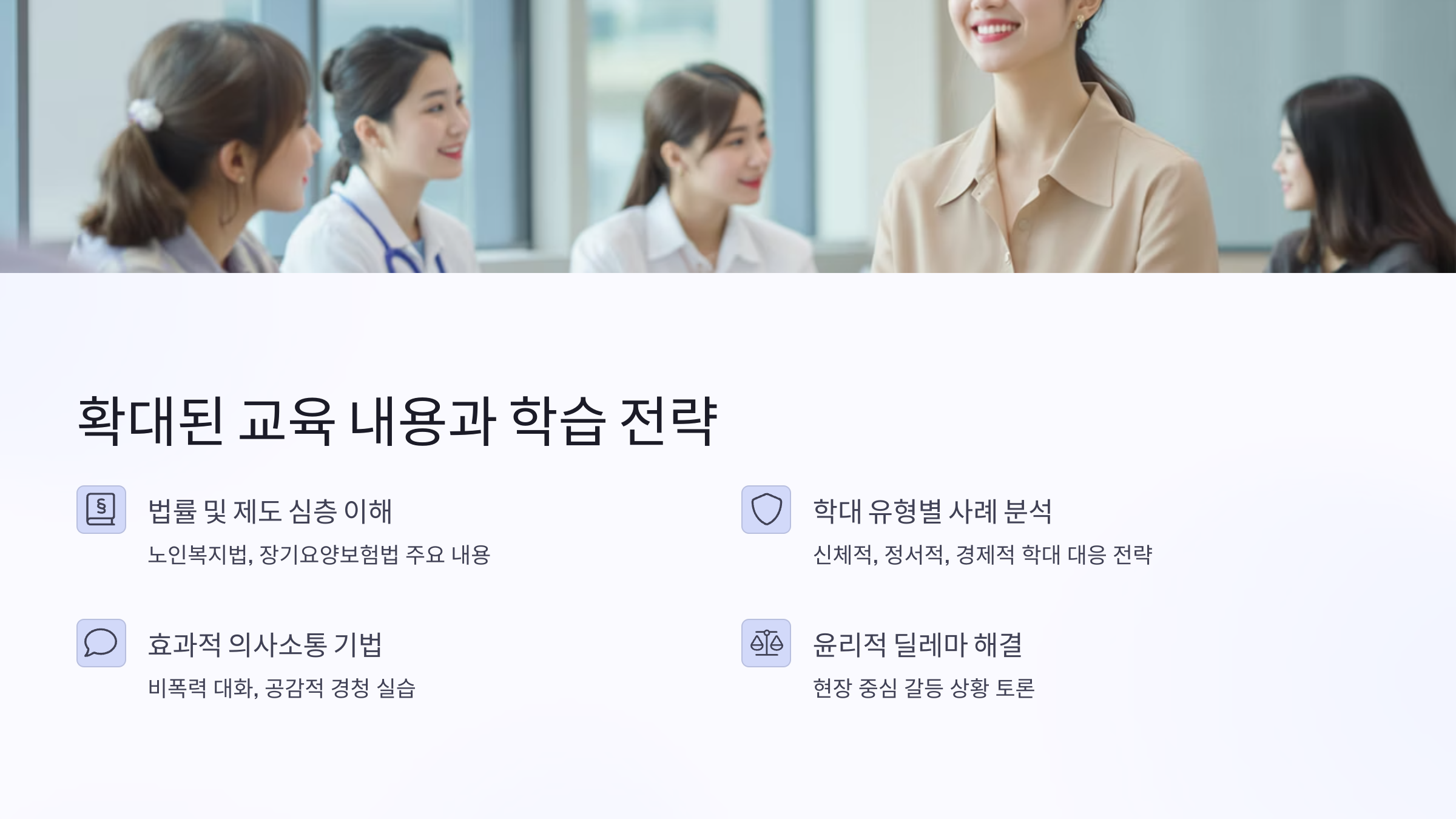- 노인 인권 침해 예방 강화: 교육 시간 확대를 통해 다양한 노인 인권 침해 유형, 발생 원인, 예방 전략 등을 보다 심도 있게 학습하도록 하여 사전 예방 역량을 강화합니다.