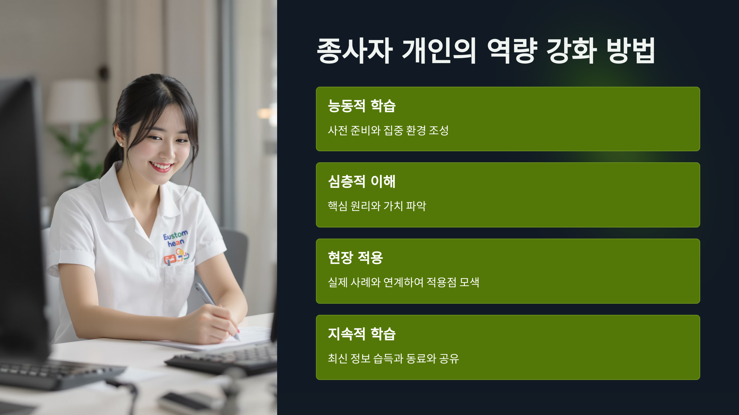 - 일회성 교육으로 그치지 않고, 정기적인 보수 교육 및 스터디 그룹 운영 지원 등을 통해 지속적인 학습 분위기를 조성합니다.