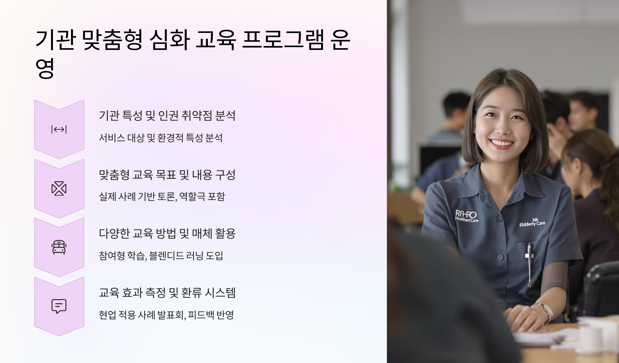 이처럼 체계적으로 기획되고 운영되는 기관 자체 심화 교육 프로그램은 kohi 의무교육의 효과를 배가시키고, 모든 종사자가 인권 존중을 내재화하여 최상의 돌봄 서비스를 제공하는 밑거름이 될 것입니다.